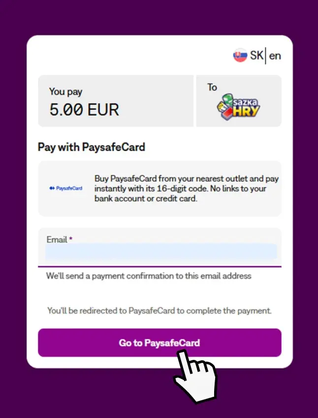 Po stlačení vložiť na konto sa dostaneš na Paysafecard rozhranie, kde zadáš svoj email.
