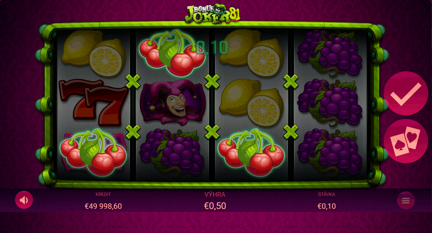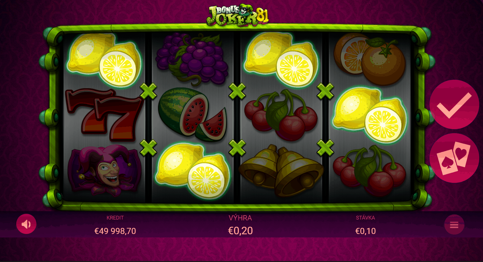 Vo výhernom automate Bonus Joker 81 nájdeš dobre známe symboly ako čerešne, citróny, slivky, hrozno či melóny.